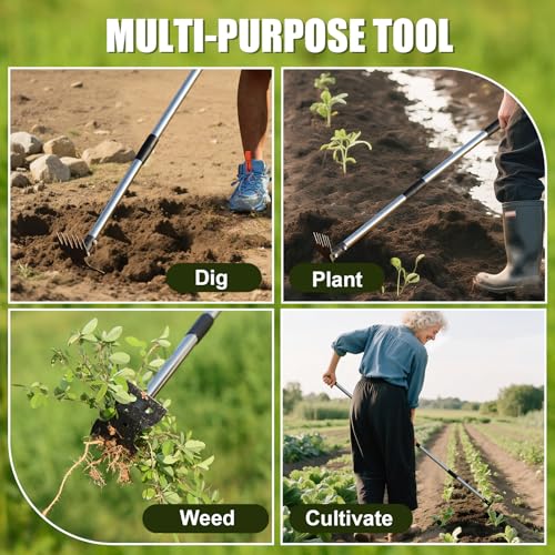 The 2-in-1 Weeder and Garden Hoe combines two essential gardening tools into one, efficiently tackling everyday landscaping tasks. Its durable cast steel head ensures long-lasting performance while the adjustable 57-inch handle promotes comfortable use with less strain. Ideal for tackling weeds and preparing soil, it comes with protective gloves for added safety and comfort.
