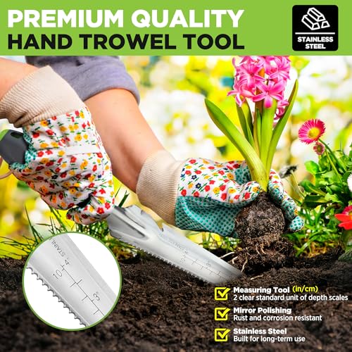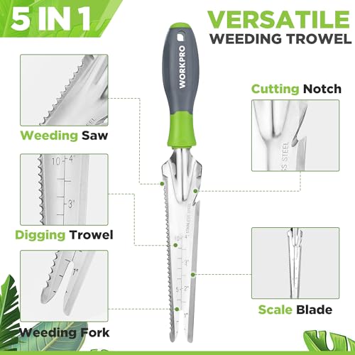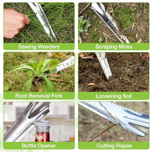 Introducing the 5-in-1 Garden Weeding Trowel, a versatile hand tool designed for effective weed removal and planting. It features a fork head for deep digging and serrated edges for easy weeding. Made of high-hardness polished stainless steel, it resists rust and deformation, ensuring durability. The ergonomic soft-grip handle reduces fatigue, making it comfortable to use. This trowel is perfect for various gardening tasks, including transplanting, digging, and loosening soil, suitable for both indoor and outdoor gardening needs.