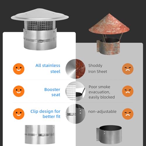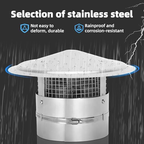The Upgraded Chimney Rain Cap offers enhanced protection against rainwater, preventing moisture and mold issues within your chimney. Its higher screen design improves combustion and ensures smooth smoke evacuation. This stainless steel cap is versatile, suitable for oil or wood-burning stoves, ensuring a smoke-free environment. Installation is hassle-free with an included pair of gloves; simply snap it on and tighten the hoop for a secure fit. The adjustable hoop allows a perfect fit within a 1cm diameter range, effectively preventing debris and rainwater from entering your chimney.