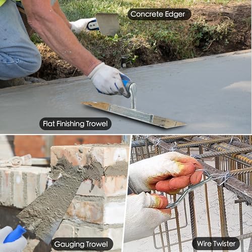 Konvixon 10PCS Concrete Trowel Set, Masonry Hand Tool Set Includes Large Flat Finishing and Pool Trowel, Wood Float, Concrete Edger and Groover, Margin Gauging, Wire Twister, Gloves & Carry Bag