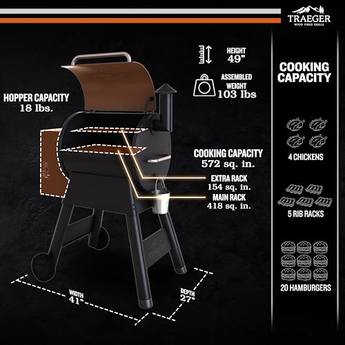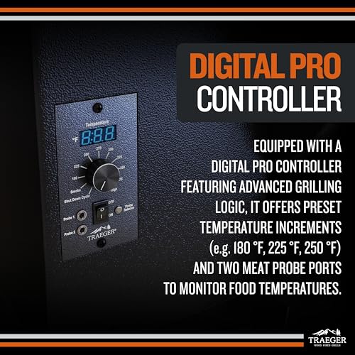 The Traeger Pro 22 is a versatile 6-in-1 wood pellet smoker and grill that allows you to grill, smoke, bake, roast, braise, and BBQ, ensuring authentic wood-fired flavor for every meal. It features precise temperature control ranging from 180°F to 450°F, allowing for consistent cooking results. The sturdy design includes a rugged chassis and porcelain-coated grates for durability and easy cleaning. Convenient features like a built-in meat probe for monitoring internal temperatures and an 18lb hopper for long cooking sessions enhance your grilling experience, while the clean-out door makes flavor swaps quick and easy. This grill is ideal for anyone looking to elevate their outdoor cooking.