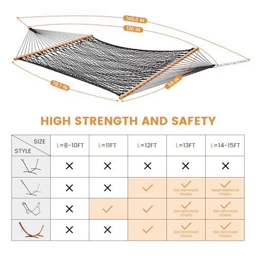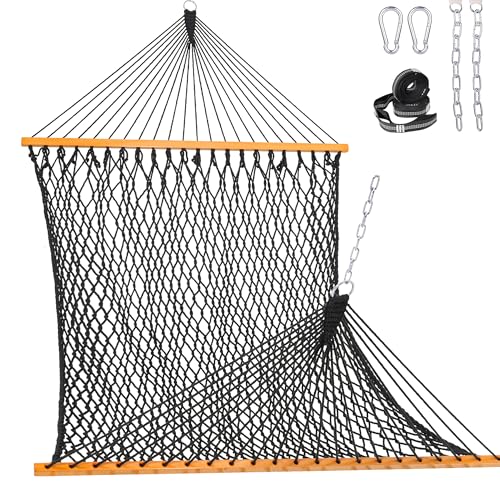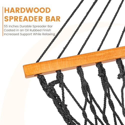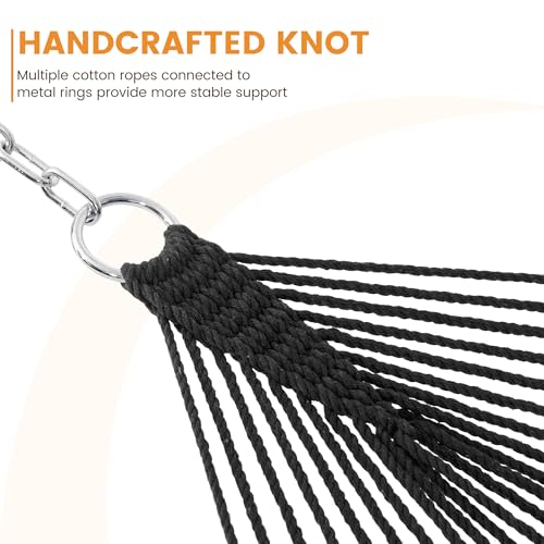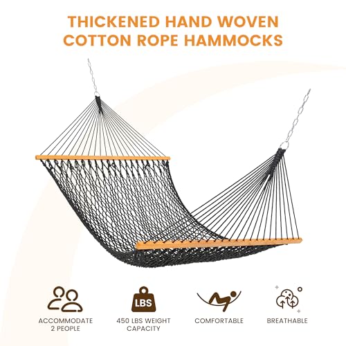 Lazy Daze Hammocks Double Rope Hammock, 2 Person Traditional Outdoor Hand Woven Cotton Rope Hammock with Spreader Bar, Chains, Tree Straps for Patio Yard – Max 450 Lbs, Dark Grey