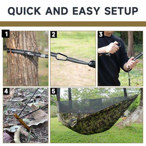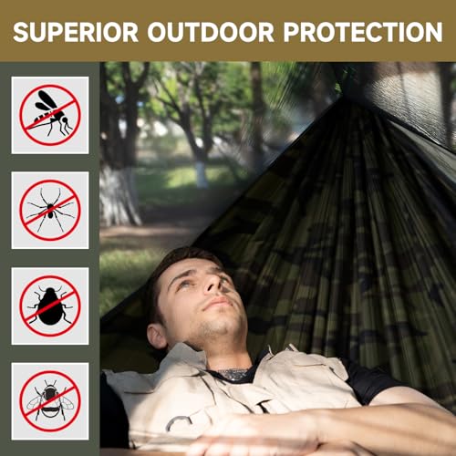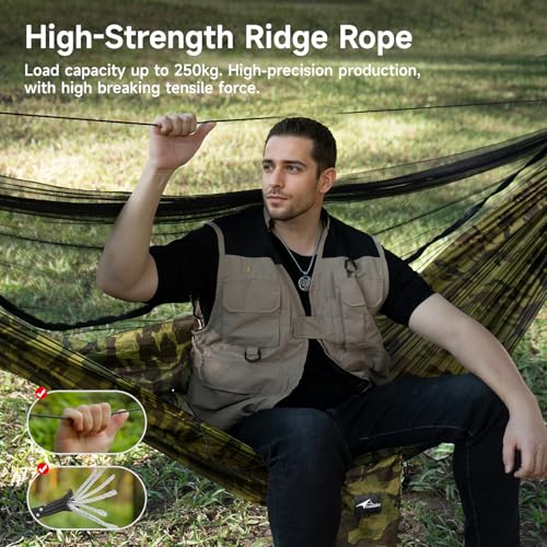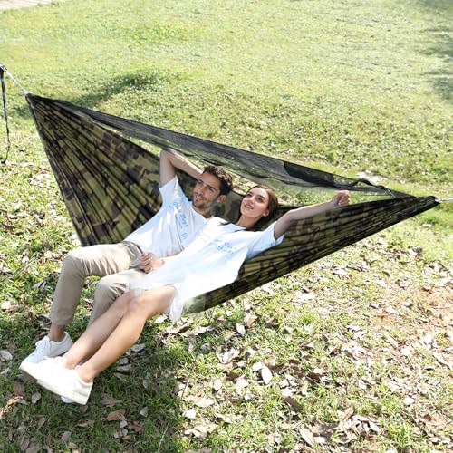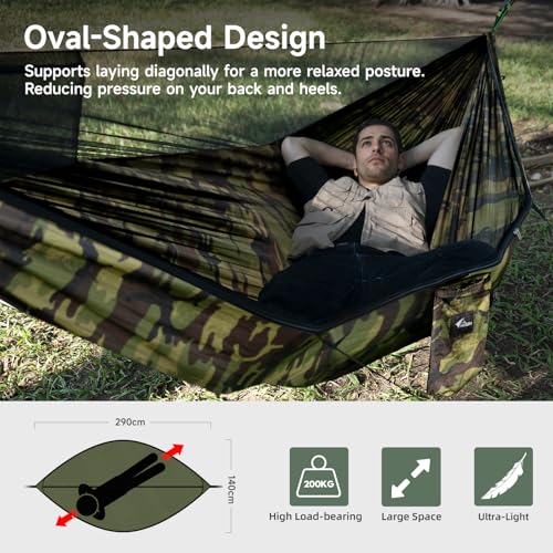 The upgraded outdoor hammock offers an expansive size of 114″ x 55″, featuring an oval design for optimized comfort that allows a diagonal lying position. It is constructed with durable materials supporting up to 550 pounds, enhancing safety with its robust ridged rope, which also functions as a handrail. The built-in mosquito net provides effective protection while ensuring ventilation. The complete kit includes elastic ropes, tent stakes, carabiners, and adjustable tree straps for an easy setup. Ideal for outdoor use, this hammock combines comfort, safety, and convenience.