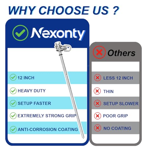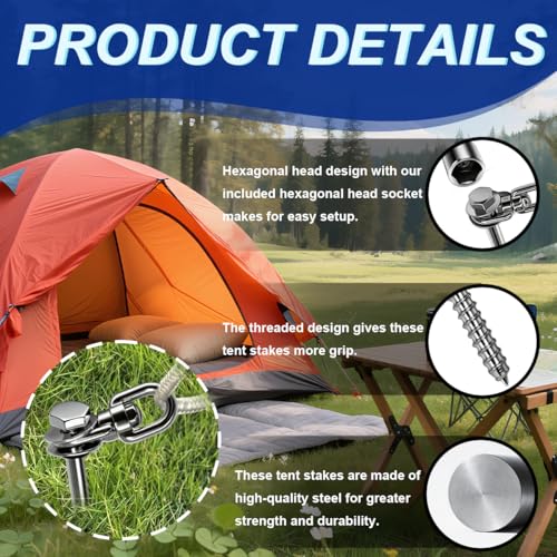 The Nexonty screw-in ground stakes are designed for quick and efficient setup, making them ideal for tents and outdoor equipment. Made from high-quality alloy steel, these durable stakes feature an excellent galvanized coating for corrosion resistance. Their threaded design provides superior grip, allowing them to penetrate various ground types easily. At 12 inches long, with 7.9 inches being threaded, they offer enhanced stability against strong winds. These stakes come with a compact carrying bag, ensuring easy storage and transport, making them a practical choice for outdoor enthusiasts.