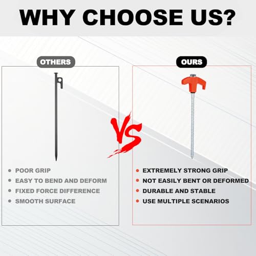 The camping tent stakes are made from high-quality carbon steel, ensuring rust resistance and longevity, even in wet conditions. At 8 inches long and 0.31 inches in diameter, these stakes provide a sturdy grip on various surfaces. Their threaded design enhances stability, making them easy to install with a cordless drill or impact driver. Ideal for securing tents firmly to the ground, these stakes are a versatile addition to any camping gear. Plus, the product comes with a satisfaction guarantee, offering customer support for any inquiries.