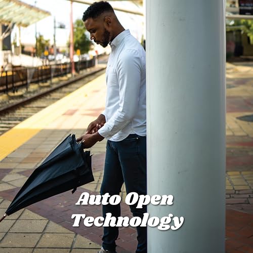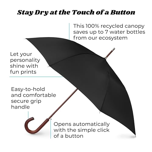 The automatic umbrella features a simple push-button mechanism for quick and effortless protection against the elements, making it user-friendly, especially with full hands. It showcases a stylish wood crook handle that adds elegance while providing a comfortable grip. Furthermore, its sturdy design doubles as a walking stick, ensuring reliable support and increased mobility in adverse weather. Made of 100% polyester, this rainproof umbrella serves multiple purposes, making it an ideal accessory for both heavy rain and as a fashionable walking stick.