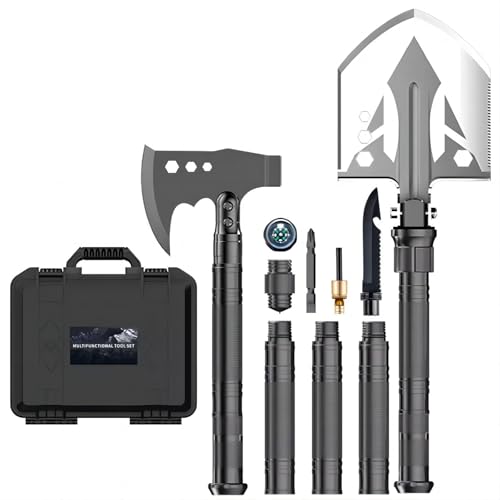 The Folding Camping Shovel Axe Combo is a comprehensive outdoor kit that includes a shovel, axe, three extension rods, whistle, attack cone, compass, various wrenches, a sawtooth, fish knife, safety hammer, flint/magnesium rod, and a screw kit, all neatly stored in a box. Made from military-grade materials, the axe and shovel are crafted from rust-resistant 3CR13 special steel, providing durability, with an ergonomic aluminum alloy handle designed for anti-slip grip. The shovel measures 5.2 x 6.5 inches and extends up to 31.5 inches, featuring a versatile twist-lock for different functionalities, enhancing its usability for camping. This all-in-one toolset makes a great gift for outdoor enthusiasts, ensuring they are well-equipped for adventures.