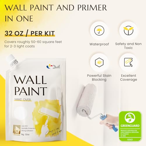 DWIL white wall paint is a versatile paint option ideal for various interior applications. Not requiring a primer, it adheres well to surfaces and offers scratches and scuffs resistance. The low-VOC formula ensures minimal odor for user comfort, making it safe for households with children and pets. This paint features fast drying times—ready for recoat in 24 hours, with full cure in 7 days—allowing for quicker project completion. Additionally, it comes with all necessary application tools, making it user-friendly. Coverage of approximately 50-55 sq.ft per 1 kg/32 oz ensures efficiency in your painting projects.