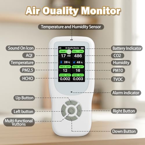 The 11-in-1 Portable Air Quality Monitor is a cutting-edge device designed to track critical air quality metrics in real time, including AQI, CO2 levels, and particulate matter. Equipped with advanced multi-sensor fusion technology, this monitor provides precise readings for various hazardous substances, ensuring a safe indoor environment. Its dual alarm system alerts users promptly with color-coded icons and a loud alarm when air quality deteriorates. A clear, backlit LCD display allows for easy reading of data day or night, making it an essential tool for maintaining healthy air quality in your home or workspace.