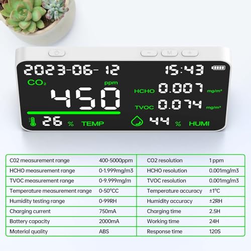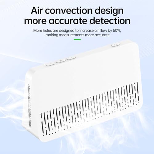The 7-in-1 air quality monitor provides a comprehensive solution for tracking your indoor environment by measuring CO2 levels, humidity, temperature, HCHO, and TVOC. Its intuitive LED display ensures easy readability, day or night. The device features an energy-saving mode and a rechargeable battery for ultimate convenience, while notifying users when CO2 levels are unhealthy. This product is designed to help you create a healthier living space quickly and conveniently.