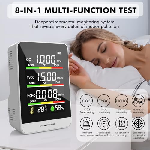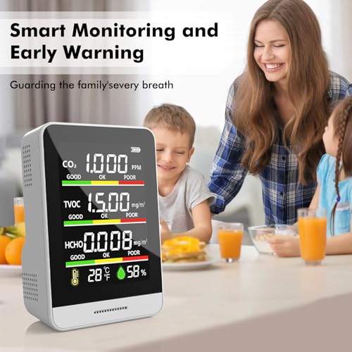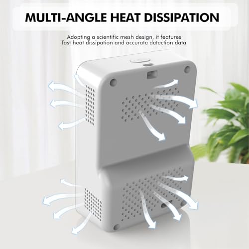 The indoor air quality monitor is an essential tool for anyone concerned about their living environment. Featuring a versatile indoor air test kit, it accurately measures real-time levels of AQI, CO2, HCHO, and TVOC, along with temperature and humidity. The advanced sensor technology and double ventilation structure ensure high accuracy, providing reliable data with minimal errors. The device boasts a large, colorful display that presents five key measurements, making it easy to interpret air quality at a glance through a color-coded system. Powered by a high-performance chip, it effectively captures weak currents generated during electrochemical reactions, ensuring precise HCHO measurements. This air monitor promotes peace of mind by ensuring you breathe cleaner air.