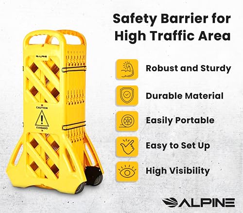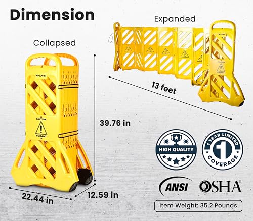 The safety barrier is ANSI- and OSHA-compliant, ensuring that it meets the necessary regulations for both indoor and outdoor environments. Its expandable and retractable design offers maximum flexibility, making it suitable for various applications such as driveways, traffic zones, and crowd control at events. Constructed from heavy-duty, weather-resistant materials, this barrier is built to endure the harsh conditions found in construction sites, warehouses, and parking lots. With a quick and easy setup process, it allows users to establish immediate safety measures wherever necessary.