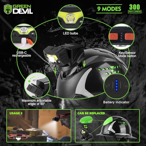 Green Devil Hard Hat with Headlight, Vented Safety Helmet