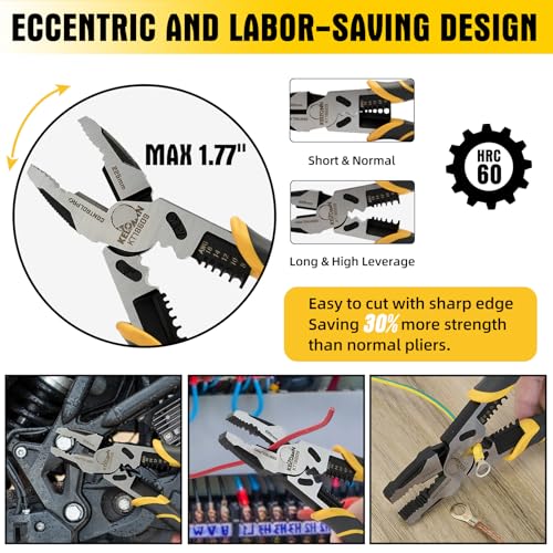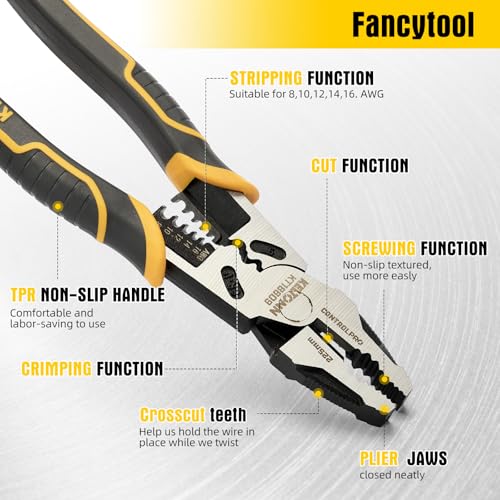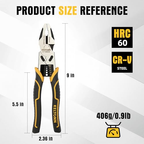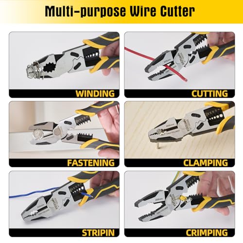 The 6-in-1 Combination Tool is a versatile plier designed for various applications including wire cutting, stripping, crimping, twisting, gripping, and side cutting. Constructed from heavy-duty chrome vanadium steel, it ensures durability and strength for demanding tasks. With precision-hardened blades, it provides clean cuts for copper, aluminum, and steel wires. The ergonomic 9-inch grip features non-slip rubber handles, offering comfort and control, making it ideal for both professional installations and home repairs.
