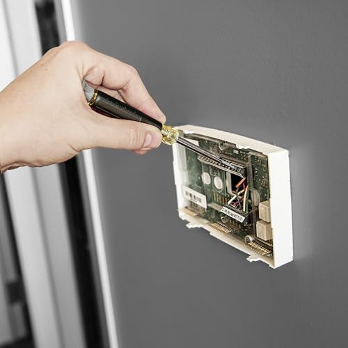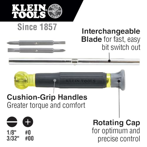 The Klein Tools 4-in-1 Electronics Screwdriver is designed for precision and versatility, making it ideal for electronic projects. Its non-magnetic tips ensure careful handling of delicate components, while the premium free-spinning cap offers excellent control and comfort during use. The chrome-plated barrel adds a smooth finish and corrosion resistance, enhancing durability. Additionally, the precision-machined, heat-treated bits ensure a precise fit, minimizing the risk of cam-out. This screwdriver is an essential tool for technicians and hobbyists alike, providing reliable performance for various tasks.