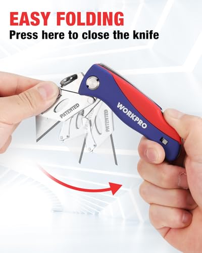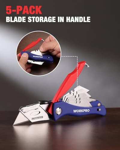 The WORKPRO folding utility knife is designed for safety and ease of use. Its quality steel handle features an anti-slip ABS grip, ensuring security while cutting. The ergonomic curve offers comfort, while the back lock mechanism keeps blades secure. Changing blades is simple, thanks to a quick-change mechanism compatible with standard blades. Lightweight and compact, it comes with a belt clip for convenient carrying and can store up to five extra blades. Made with durable materials, this utility knife is built to last, making it an essential tool for various tasks.